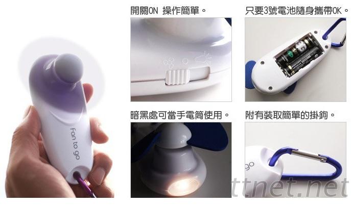 只要打開開關風扇就會飛快的轉動,於是柔和的微風便會吹來,「手拿式風扇機」的登場。